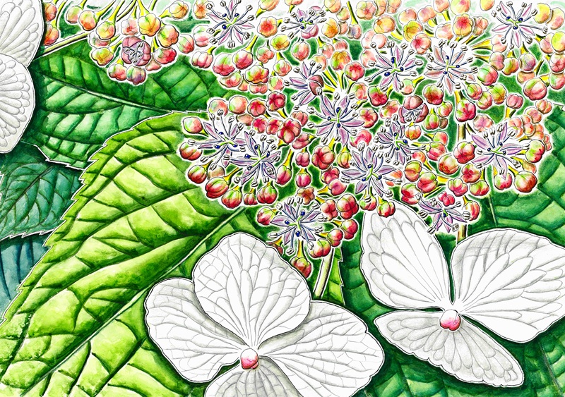 外側の花びら状のものは花びらではなく“装飾花(ガク)”で、内側の小さなものが受粉可能な本当の花です。